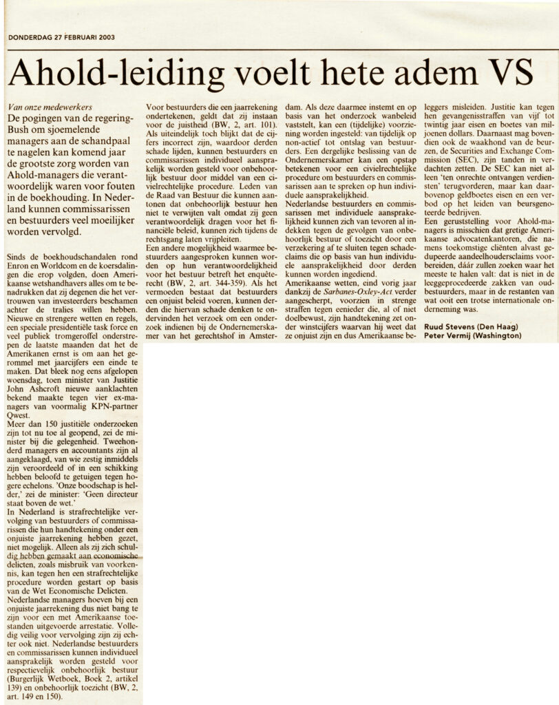 Amerikaanse wetten, eind vorig jaar dankzij de Sarbanes-Oxley-Act verder aangescherpt, voorzien in strenge straffen tegen eenieder die, al of niet doelbewust, zijn handtekening zet onder winstcijfers waarvan hij weet dat ze onjuist zijn en dus Amerikaanse beleggers misleiden. Justitie kan tegen hen gevangenisstraffen van vijf tot twintig jaar eisen en boetes van miljoenen dollars. Daarnaast mag bovendien ook de waakhond van de beurzen, de Securities and Exchange Commission (SEC), zijn tanden in verdachten zetten. De SEC kan niet alleen ‘ten onrechte ontvangen verdiensten’ (salaris, bonussen, aandelenopties en dergelijke) terugvorderen, maar kan daarbovenop geldboetes eisen en een verbod op het leiden van beursgenoteerde bedrijven.
