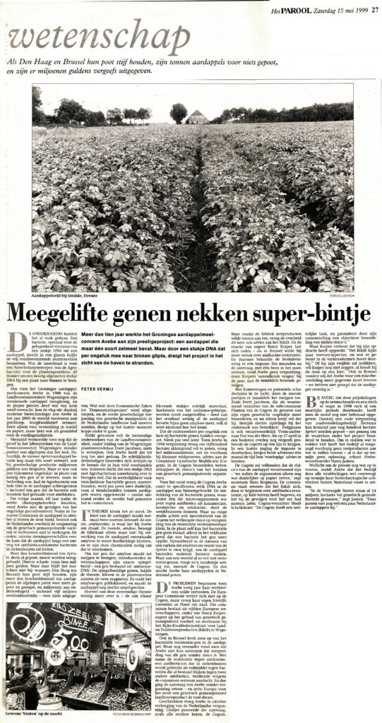 Dat de onderzoekers per ongeluk een hele rij bacteriële genen hadden overgezet, bleek pas veel later. Toen Avebe in 1994 vergunning vroeg om vijfhonderd hectare akkergrond vol te poten, vroeg het milieuministerie, net als voorheen bij kleinere veldproeven, advies aan de Commissie Genetische Modificatie (Cogem). In de Cogem beoordelen weten- schappers de risico’s van het loslaten van genetisch gemanipuleerde organismen.