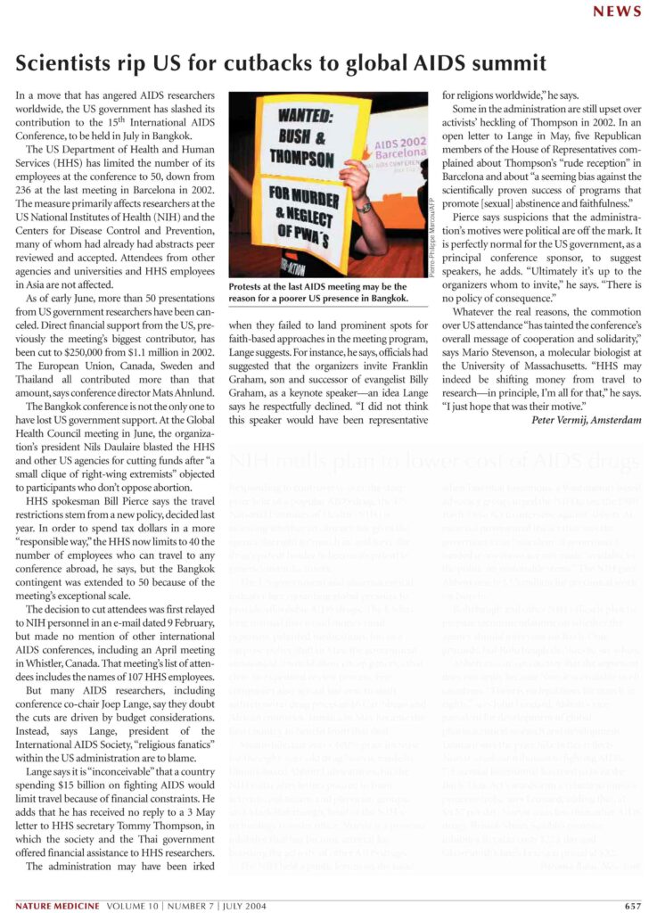 Lange says it is ‘inconceivable’ that a country spending $15 billion on fighting AIDS would limit travel because of financial constraints. He adds that he has received no reply to a 3 May letter to HHS secretary Tommy Thompson, in which the society and the Thai government offered financial assistance to HHS researchers.