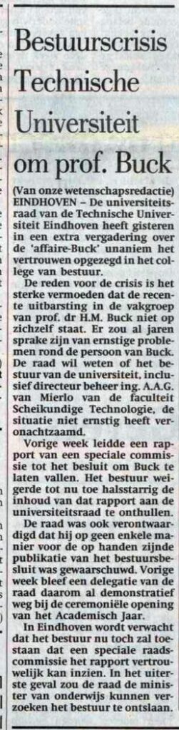 EINDHOVEN – De universiteitsraad van de Technische Universiteit Eindhoven heeft gisteren in een extra vergadering over de ‘affaire-Buck’ unaniem het vertrouwen opgezegd in het college van bestuur.