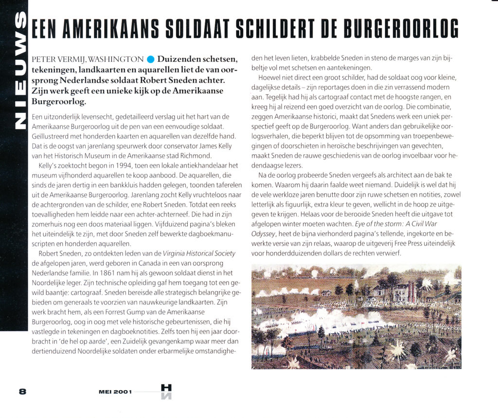 Helaas voor de berooide Sneden heeft die uitgave tot afgelopen winter moeten wachten. Eye of the storm: A Civil War Odyssey, heet de bijna vierhonderd pagina’s tellende ingekorte en bewerkte versie van zijn relaas, waarop de uitgeverij Free Press uiteindelijk voor honderdduizenden dollars de rechten verwierf.