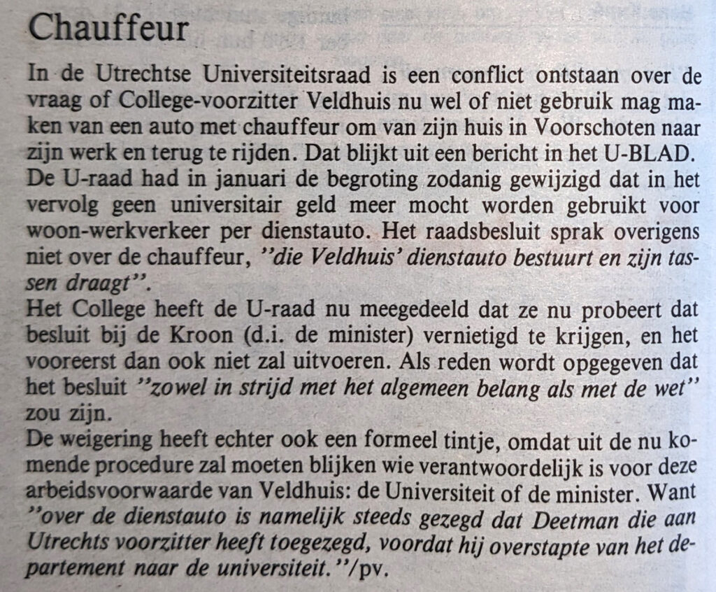 De U-raad had in januari de begroting zodanig gewijzigd dat in het vervolg geen universitair geld meer mocht worden gebruikt voor woon-werkverkeer per dienstauto. Het raadsbesluit sprak overigens niet over de chauffeur, “die Veldhuis’ dienstauto bestuurt en zijn tassen draagt”.