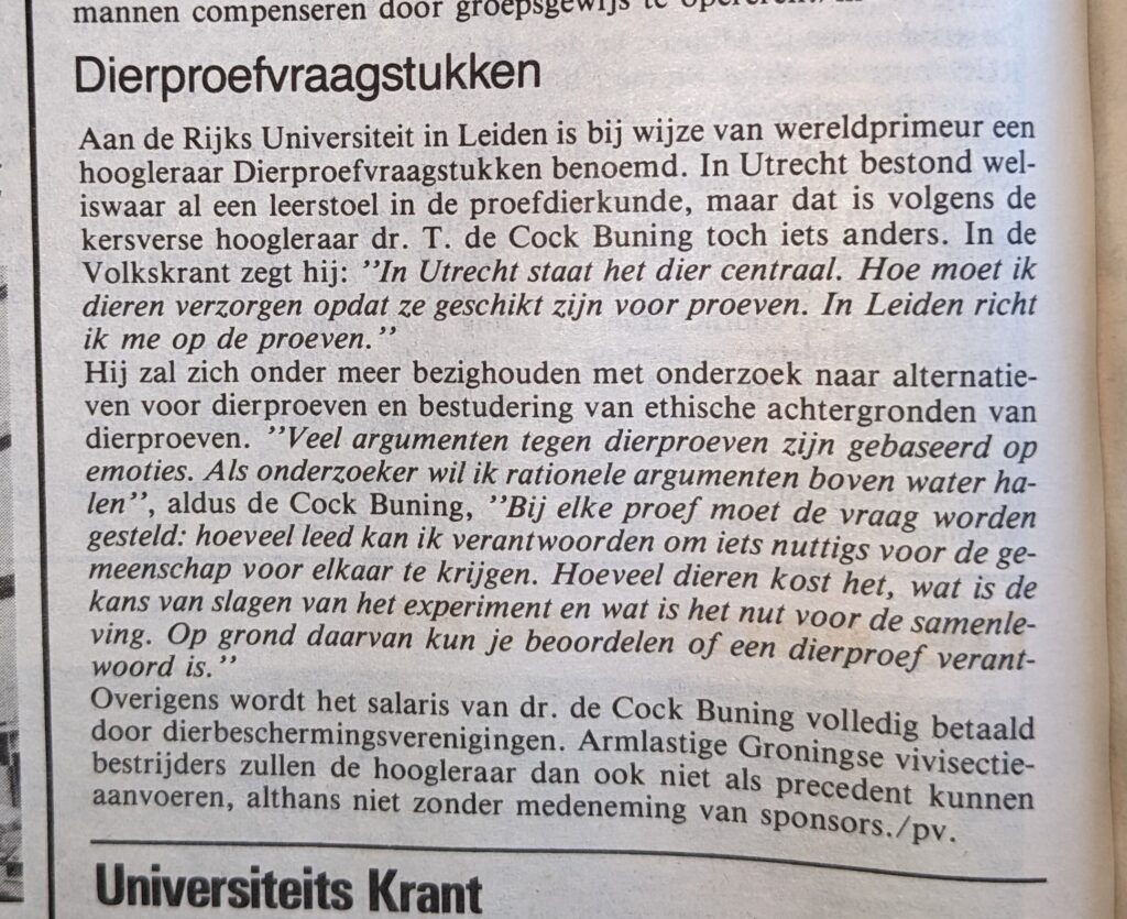 Aan de Rijks Universiteit in Leiden is bij wijze van wereldprimeur een hoogleraar Dierproefvraagstukken benoemd. In Utrecht bestond weliswaar al een leerstoel in de proefdierkunde, maar dat is volgens de kersverse hoogleraar dr. T. de Cock Buning toch iets anders. In de Volkskrant zegt hij: ”’In Utrecht staat het dier centraal. Hoe moet ik dieren verzorgen opdat ze geschikt zijn voor proeven. In Leiden richt ik me op de proeven.”