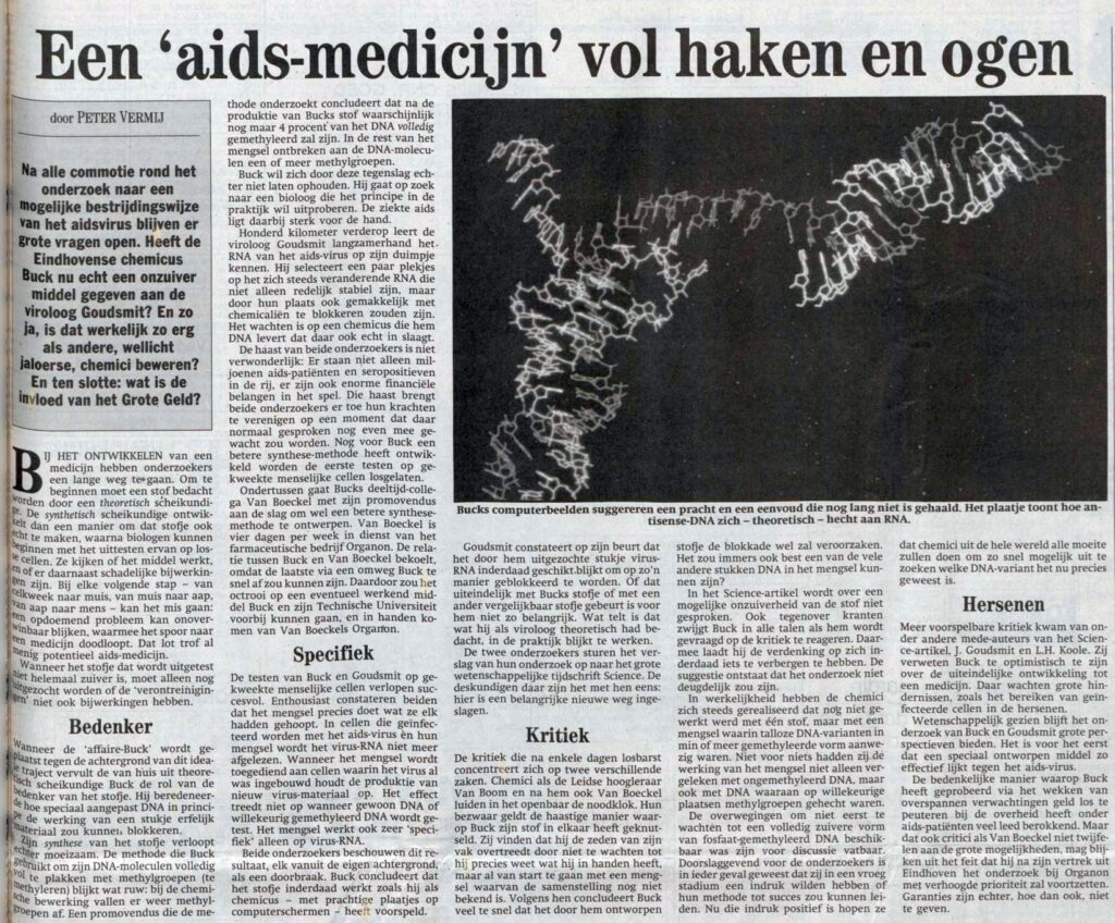 Na alle commotie rond het onderzoek naar een mogelijke bestrijdingswijze van het aidsvirus blijven er grote vragen open. Heeft de Eindhovense chemicus Buck nu echt een onzuiver middel gegeven aan de viroloog Goudsmit? En zo ja, is dat werkelijk zo erg als andere, wellicht jaloerse, chemici beweren? En ten slotte: wat is de invloed van het Grote Geld?