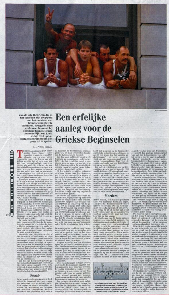 TOEN DE Amerikaanse DNA-onderzoeker Dean Hamer enkele maanden geleden, in een achterafzaaltje van een groot wetenschappelijk congres in Boston, aan zijn gehoor vertelde dat hij zocht naar een gen voor homoseksualiteit, was grote scepsis zijn deel. De gedachte dat een ingewikkeld gedragskenmerk als de seksuele begeerte kan worden gekoppeld aan één enkel gen, leek de aanwezige wetenschappers een treffend voorbeeld van ernstige overschatting van de moderne erfelijkheidswetenschap.