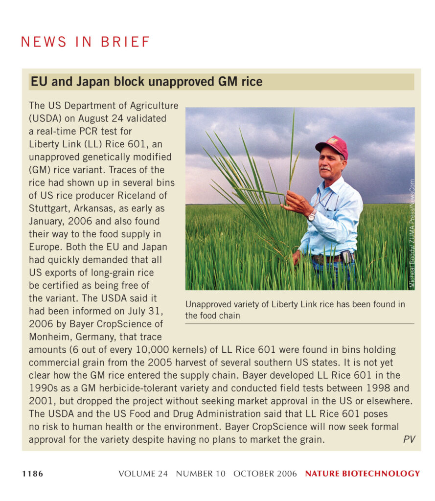 The US Department of Agriculture (USDA) on August 24 validated a real-time PCR test forLiberty Link (LL) Rice 601, an unapproved genetically modified (GM) rice variant. Traces of the rice had shown up in several bins of US rice producer Riceland of Stuttgart, Arkansas, as early as January, 2006 and also found their way to the food supply in Europe.