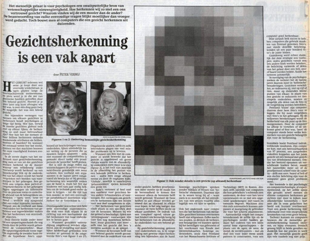 Het boeiende is dat psychologie en computertechnologie, al experimenterend, op hetzelfde spoor zijn geraakt: zowel mensen als slimme computers herkennen gezichten niet door te kijken naar afzonderlijke kenmerken – hoezeer die in onze gedachten het beeld ook kunnen overheersen. Voor een goede herkenning lijkt informatie over vele onopvallende kenmerken van even groot belang.