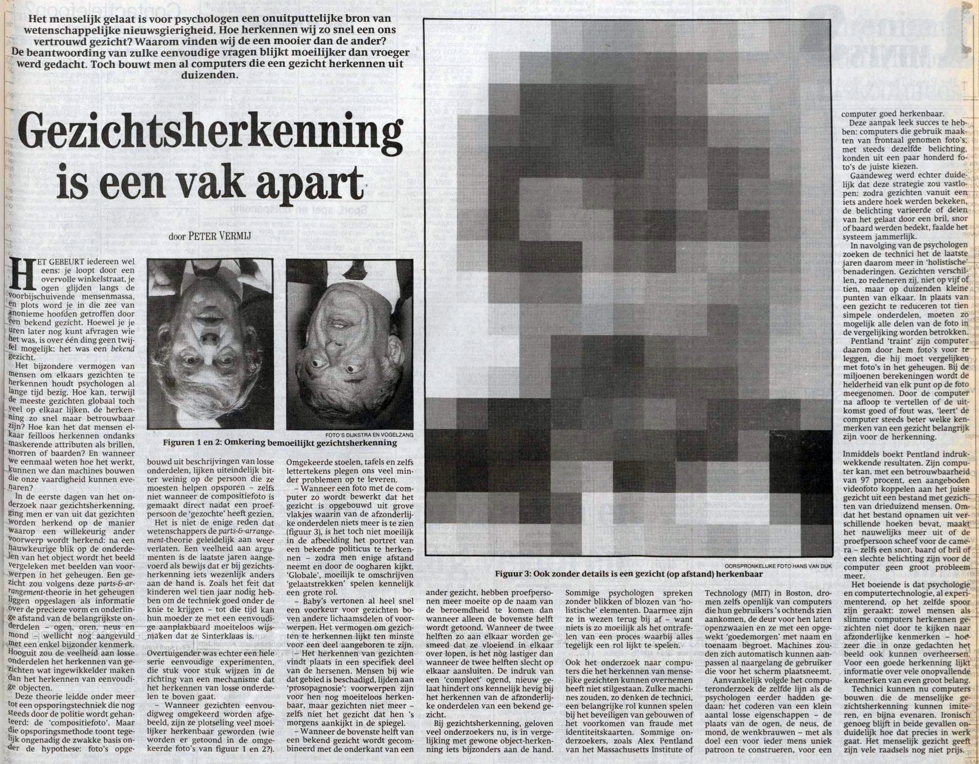 Het bijzondere vermogen van mensen om elkaars gezichten te herkennen houdt psychologen al lange tijd bezig. Hoe kan, terwijl de meeste gezichten globaal toch veel op elkaar lijken, de herkenning zo snel maar betrouwbaar zijn? Hoe kan het dat mensen elkaar feilloos herkennen ondanks maskerende attributen als brillen, snorren of baarden? En wanneer we eenmaal weten hoe het werkt, kunnen we dan machines bouwen die onze vaardigheid kunnen evenaren?
