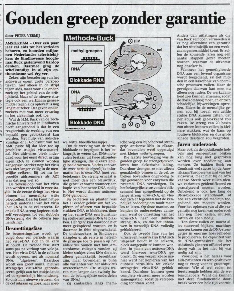 Wat dr H.M. Buck van de Technische Universiteit in Eindhoven heeft aangetoond is dat in een reageerbuis de werking van een bepaald gen geblokkeerd kan worden. Met hulp van aids-deskundige dr J. Goudsmit van het AMC paste hij dat idee toe op geschikte stukjes virus-materiaal. Het aids-virus bleek inderdaad voor het eerst direct in zijn eigen RNA te kunnen worden aangepakt. Sterker nog: het virus was niet langer veilig in de menselijke celkern. Bij tot nu beproefde aidsremmers als AZT was dat nog wel zo.