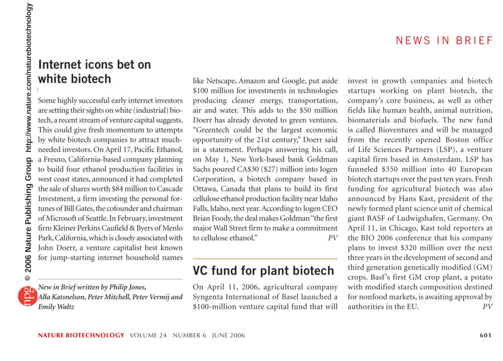 Perhaps answering his call, on May 1, New York-based bank Goldman Sachs poured CA$30 ($27) million into Iogen Corporation, a biotech company based in Ottawa, Canada that plans to build its first cellulose ethanol production facility near Idaho Falls, Idaho, next year. According to Iogen CEO Brian Foody, the deal makes Goldman “the first major Wall Street firm to make a commitmentto cellulose ethanol.”