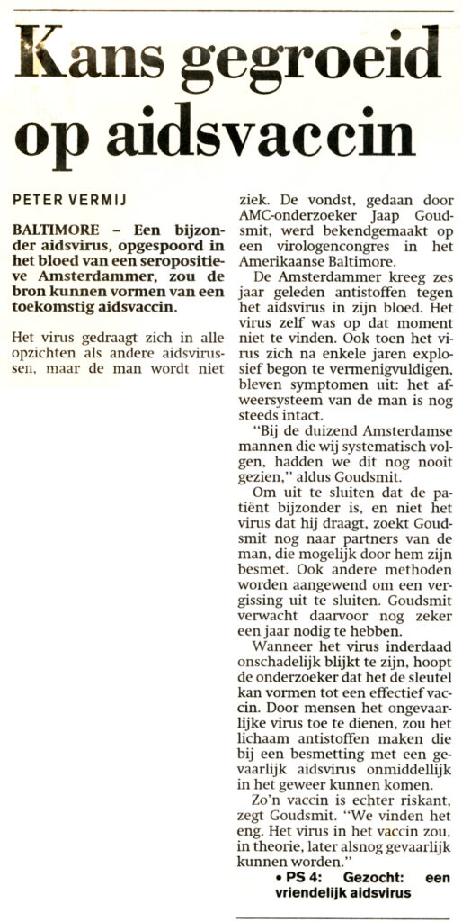 Het virus gedraagt zich in alle opzichten als andere aidsvirussen, maar de man wordt niet ziek. De vondst, gedaan door AMC-onderzoeker Jaap Goudsmit, werd bekendgemaakt op een virologencongres in het Amerikaanse Baltimore.