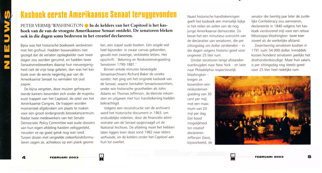 Nadat twee medewerkers van het Senate Democratic Policy Committee wat oude dossiers van hun eigen afdeling hadden veiliggesteld, neusden ze op goed geluk nog wat rond. Tussen dozen met vergeelde ziekenfondsformulieren zagen ze, achteloos op een plank gesmeten, een stapel oude boeken. Eén oogde wel heel bijzonder: in zwaar canvas gebonden, gevuld met zwierige, verbleekte letters. Het opschrift: ‘Beloning en Reiskostenvergoeding Senatoren — 1790-1881.’