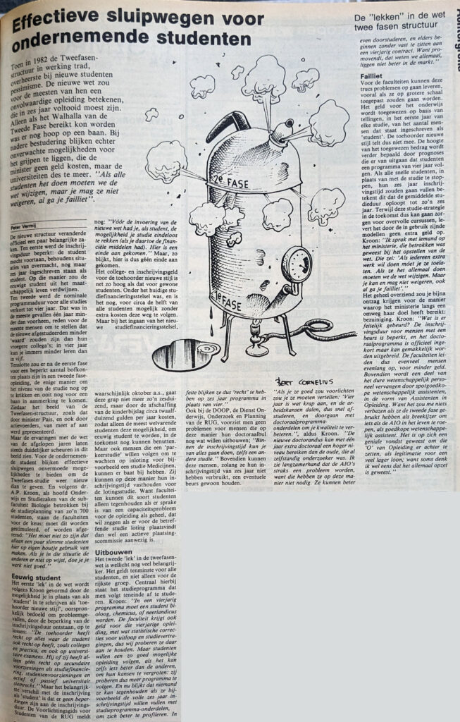 Maar de ervaringen met de wet van de afgelopen jaren laten steeds duidelijker scheuren in dit beeld zien. Voor de ondernemende student blijken effectieve sluipwegen onvermoede mogelijkheden te bieden om de Tweefasen-studie weer nieuw élan te geven. En volgens dr. A.P. Kroon, als hoofd Onderwijs en Studiezaken van de subfaculteit Biologie betrokken bij de studieplanning van zo’n 700 studenten, staan de faculteiten voor de keus: moet dit worden gestimuleerd, of worden. afgeremd: “Het moet niet zo zijn dat alleen een paar slimme studenten hier op eigen houtje gebruik van maken. Als je in die situatie de anderen er niet op wijst, doe je je werk niet goed.”