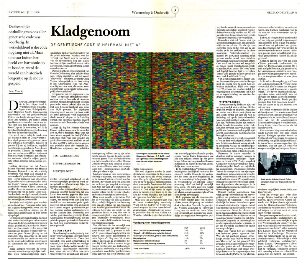 Collins, directeur van het Amerikaanse National Institute for Human Genome Research en als zodanig boegbeeld van meer dan duizend samenwerkende academische onderzoekers, sprak gedragen over ‘de onthulling van het eerste concept van het boek des levens’. Venter, oprichter van het particuliere bedrijf Celera Genomics, meldde ‘de eerste reconstructie van de erfelijke code van de mens.’ Geen wonder dus dat in menige krantenkolom de indruk ontstond dat de ontcijfering van het menselijk DNA voltooid is.
