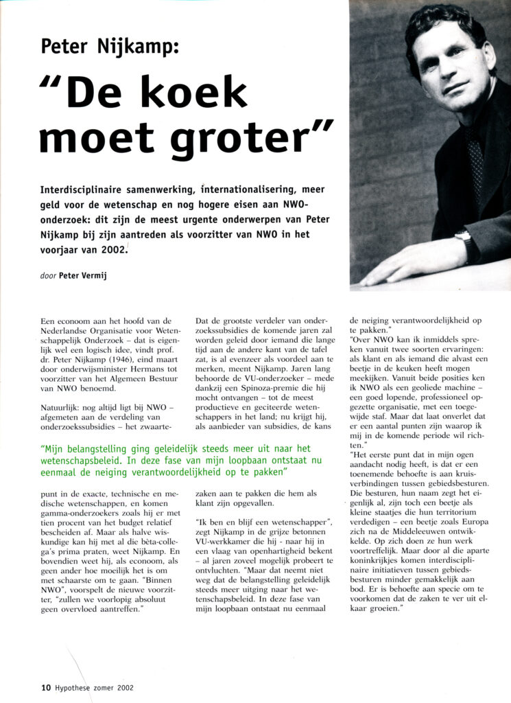 Dat de grootste verdeler van onderzoekssubsidies de komende jaren zal worden geleid door iemand die lange tijd aan de andere kant van de tafel zat, is al evenzeer als voordeel aan te merken, meent Nijkamp. Jaren lang behoorde de VU-onderzoeker — mede dankzij een Spinoza-premie die hij mocht ontvangen — tot de meest productieve en geciteerde wetenschappers in het land; nu krijgt hij, als aanbieder van subsidies, de kans zaken aan te pakken die hem als klant zijn opgevallen.