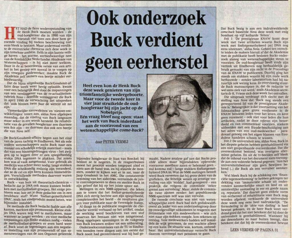 Feit 1: ‘De prestigieuze KNAW komt deze week met twee artikelen waarin Buck zijn werk met fosforgemethyleerd [sic] DNA nog eens uiteenzet,’ aldus Nova. Geheel ten onrechte leiden de makers hieruit af dat de Akademie met de publikatie heeft besloten Bucks onderzoek alsnog van wetenschappelijke steun te voorzien. De oud-hoogleraar heeft sinds zijn vertrek uit Eindhoven nog herhaaldelijk gebruik gemaakt van zijn recht in de Proceedings van de KNAW te publiceren. Daarbij ging het steeds om stukken waarin hij zijn oude werk herkauwde – zonder laboratorium had hij natuurlijk ook weinig keus. Zo overvloedig stuurde Buck manuscripten in, dat de redactie ‘er wel eens ziek van werd,’ zoals Akademie-secretaris dr K. Vrieze zich deze week liet ontvallen.