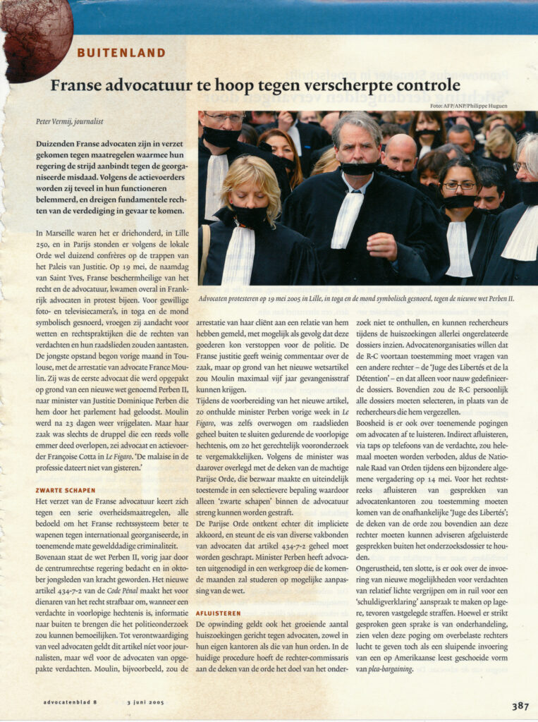 In Marseille waren het er driehonderd, in Lille 250, en in Parijs stonden er volgens de lokale Orde wel duizend confrères op de trappen van het Paleis van Justitie. Op 19 mei, de naamdag van Saint Yves, Franse beschermheilige van het recht en de advocatuur, kwamen overal in Frankrijk advocaten in protest bijeen. Voor gewillige foto- en televisiecamera’s, in toga en de mond symbolisch gesnoerd, vroegen zij aandacht voor wetten en rechtspraktijken die de rechten van verdachten en hun raadslieden zouden aantasten.
