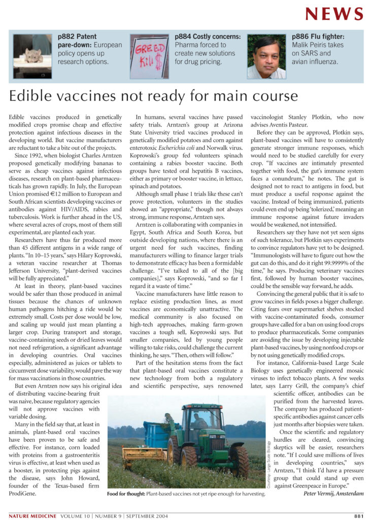 Arntzen is collaborating with companies in Egypt, South-Africa and South-Korea, but outside developing nations, where there is an urgent need for such vaccines, finding manufacturers willing to finance larger trials to demonstrate efficacy has been a formidable challenge. “I’ve talked to all of the [big] companies ,” says Koprowski, “and so far I regard it a waste of time.”