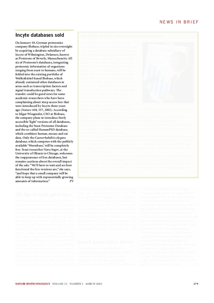 On January 18, German proteomics company Biobase tripled in size overnight by acquiring a database subsidiary of Incyte of Wilmington, Delaware, known as Proteome of Beverly, Massachusetts.