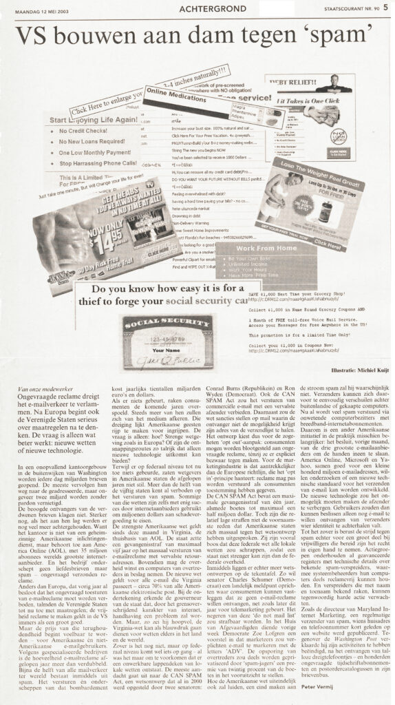 Hoe de Amerikaanse wet uiteindelijk ook zal luiden, een eind maken aan de stroom spam zal hij waarschijnlijk ook niet. Verzenders kunnen zich daarvoor te eenvoudig verschuilen achter buitenlandse of gekaapte computers. (Nu al wordt veel spam verstuurd via onwetende computerbezitters met breedband-internetabonnementen.) Daarom is een ander Amerikaanse initiatief in de praktijk misschien belangrijker: het besluit, vorige maand, van de drie grootste e-mailaanbieders om de handen ineen te slaan. America Online, Microsoft en Yahoo, samen goed voor een kleine honderd miljoen e-mailadressen, willen onderzoeken of een nieuwe technische standaard voor het verzenden van e-mail kan worden ontwikkeld. De nieuwe technologie zou het onmogelijk moeten maken de afzender te verbergen. Gebruikers zouden dan kunnen beslissen alleen nog e-mail te willen ontvangen van verzenders wier identiteit te achterhalen valt.