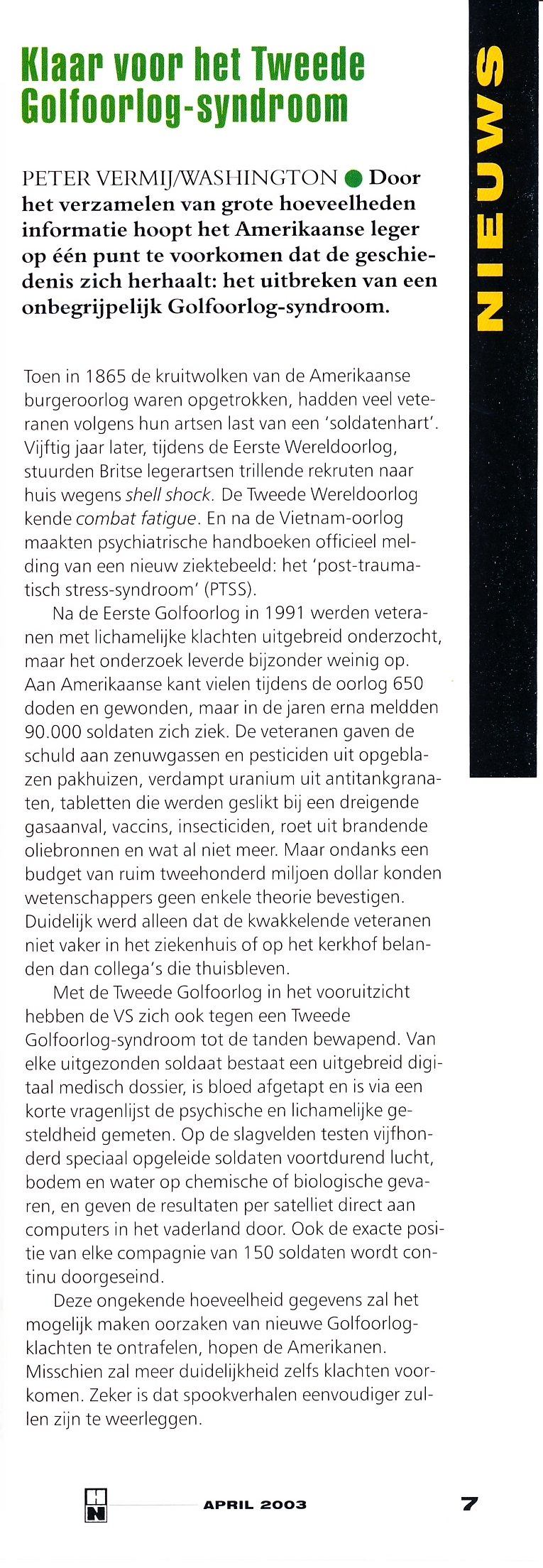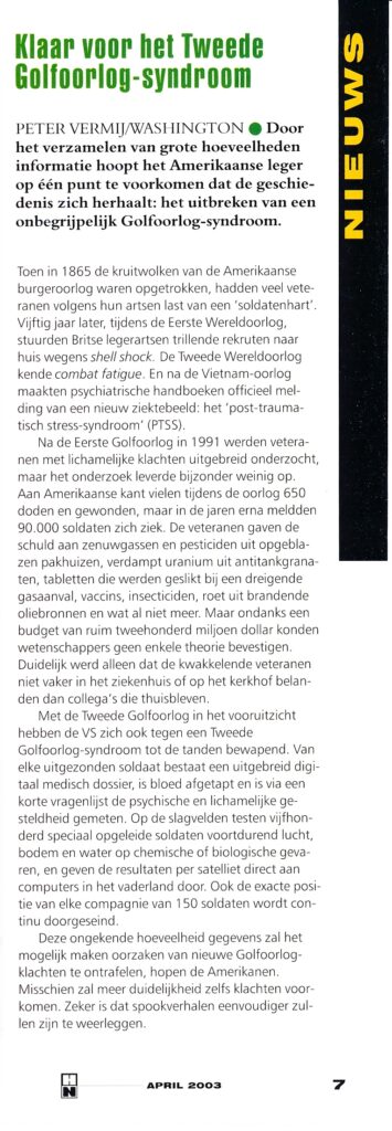 De periode na de Eerste Golfoorlog neemt een bijzondere plaats in. Zelden werden veteranen met lichamelijke klachten zó uitgebreid onderzocht, en zelden leverde zoveel onderzoek zo weinig op. Aan Amerikaanse kant telde de oorlog 650 doden en gewonden, maar in de jaren erna meldden 90.000 soldaten zich ziek. De veteranen gaven de schuld aan zenuwgassen en pesticiden uit opgeblazen pakhuizen, verdampt uranium uit antitankgranaten, tabletten die werden geslikt bij een dreigende gasaanval, vaccins, insecticiden, roet uit brandende oliebronnen en wat al niet meer. Maar ondanks een budget van ruim tweehonderd miljoen dollar konden wetenschappers geen enkele theorie bevestigen. Duidelijk werd alleen dat de kwakkelende veteranen niet vaker in het ziekenhuis of op het kerkhof belanden dan collega’s die thuisbleven.