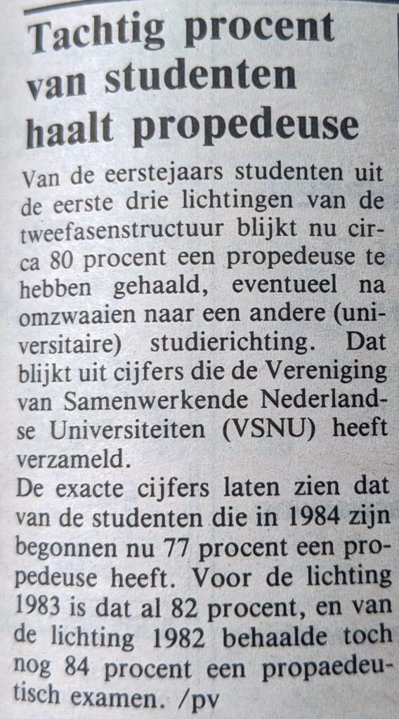 De exacte cijfers laten zien dat van de studenten die in 1984 zijn begonnen nu 77 procent een propedeuse heeft. Voor de lichting 1983 is dat al 82 procent, en van de lichting 1982 behaalde toch nog 84 procent een propaedeutisch examen.