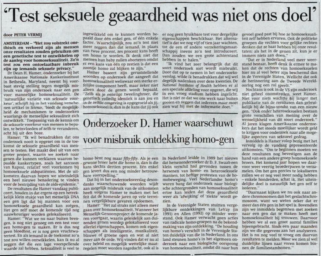 Hamer: “Het zal straks niet alleen meer gaan over homoseksualiteit. Wanneer het Menselijk-Genoomproject de komende jaren voortgaat, waarin geleidelijk aan duizenden genen worden gelokaliseerd voor allerlei eigenschappen, komen ook eigenschappen als intelligentie, muzikaliteit, blauwe of groene ogen en wat al niet meer aan de orde. Wij vinden dat er nu al over beleid en mogelijk wettelijke maatregelen moet worden nagedacht, ook al is er nog geen bruikbare test voor dergelijke eigenschappen beschikbaar. Het alternatief is dat we nog vijf of tien jaar wachten, tot de een of andere verzekeringsmaatschappij ineens zo’n test introduceert. Dan zouden we een grote achterstand hebben in te halen.”