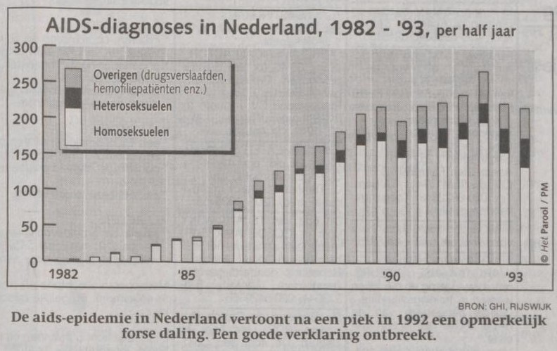 De opmerkelijke terugloop treedt alleen op bij het aantal diagnoses die zijn terug te voeren op homoseksueel geslachtsverkeer. Volgens de jongste gegevens van de Geneeskundige Hoofdinspectie voor de Volksgezondheid in Rijswijk liep het aantal nieuwe ziektegevallen onder homo- en biseksuele mannen tussen 1992 en 1993 terug van 371 tot 290 – een daling van liefst 22 procent.