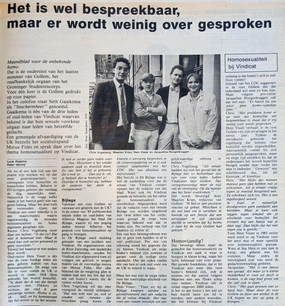 Toen Hein Visser in 1983 rector werd, werd er op Vindicat voor het eerst min of meer openlijk over homosexualiteit gepraat. Want al liep Hein er niet mee te koop, een geheim was het evenmin. Maar zodra de nieuwigheid eraf was, werd de gedachtenwisseling gesloten.