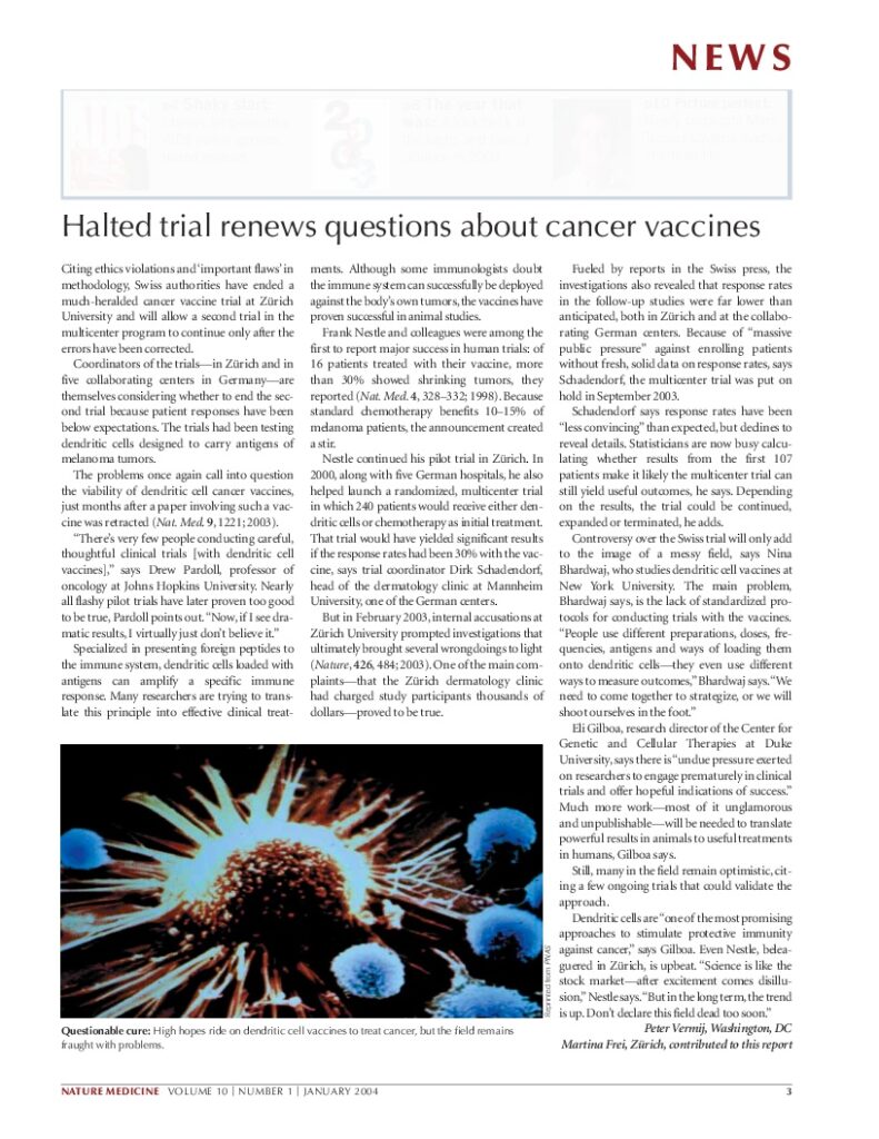 Controversy over the Swiss trial adds to the image of a messy field, predicts Nina Bhardwaj, who studies dendritic cell vaccines at New York University. The main problem, Bhardwaj says, is the lack of standardized protocols for conducting trials with the vaccines. ‘People use different preparations, doses, frequencies, antigens and ways of loading them onto dendritic cells–they even use different ways to measure outcomes,’ Bhardwaj says. ‘We need to come together to strategize, or we will shoot ourselves in the foot.’