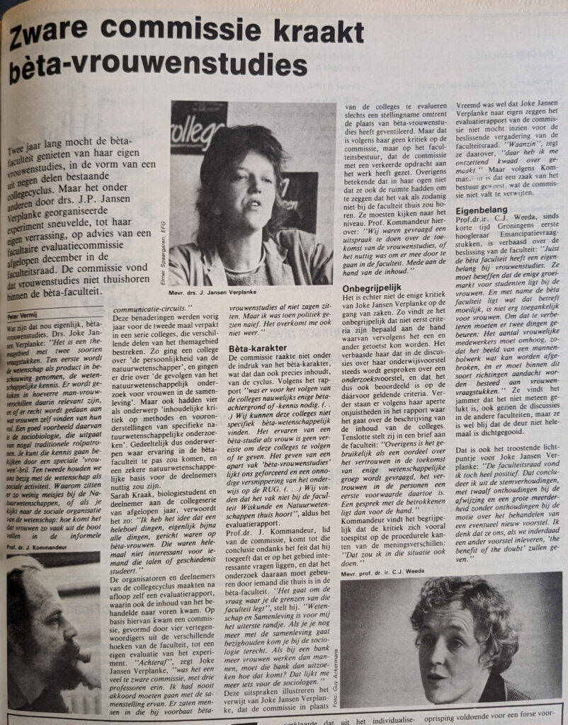 Prof.dr.ir. C.J. Weeda, sinds korte tijd Groningens eerste hoogleraar Emancipatievraagstukken, is verbaasd over de beslissing van de faculteit: ”’Juist de bèta faculteit heeft een eigenbelang bij vrouwenstudies. Ze moet beseffen dat de enige groeimarkt voor studenten ligt bij de vrouwen. En met name de bèta faculteit ligt wat dat betreft moeilijk, is niet erg toegankelijk voor vrouwen. Om dat te verbeteren moeten er twee dingen gebeuren: Het aantal vrouwelijke medewerkers moet omhoog, zodat het beeld van een mannenbolwerk wat kan worden afgebroken, èn er moet binnen dit soort richtingen aandacht worden besteed aan vrouwenvraagstukken.” Ze vindt het jammer dat het niet meteen gelukt is, ook gezien de discussies in de andere faculteiten, maar ze is wel blij dat de deur niet helemaal is dichtgegooid.